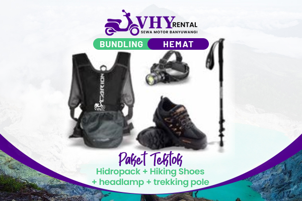 Sewa Motor Banyuwangi - Paket Tektok - Sewa Hidropack sepatu pendakian Masker Headlamp